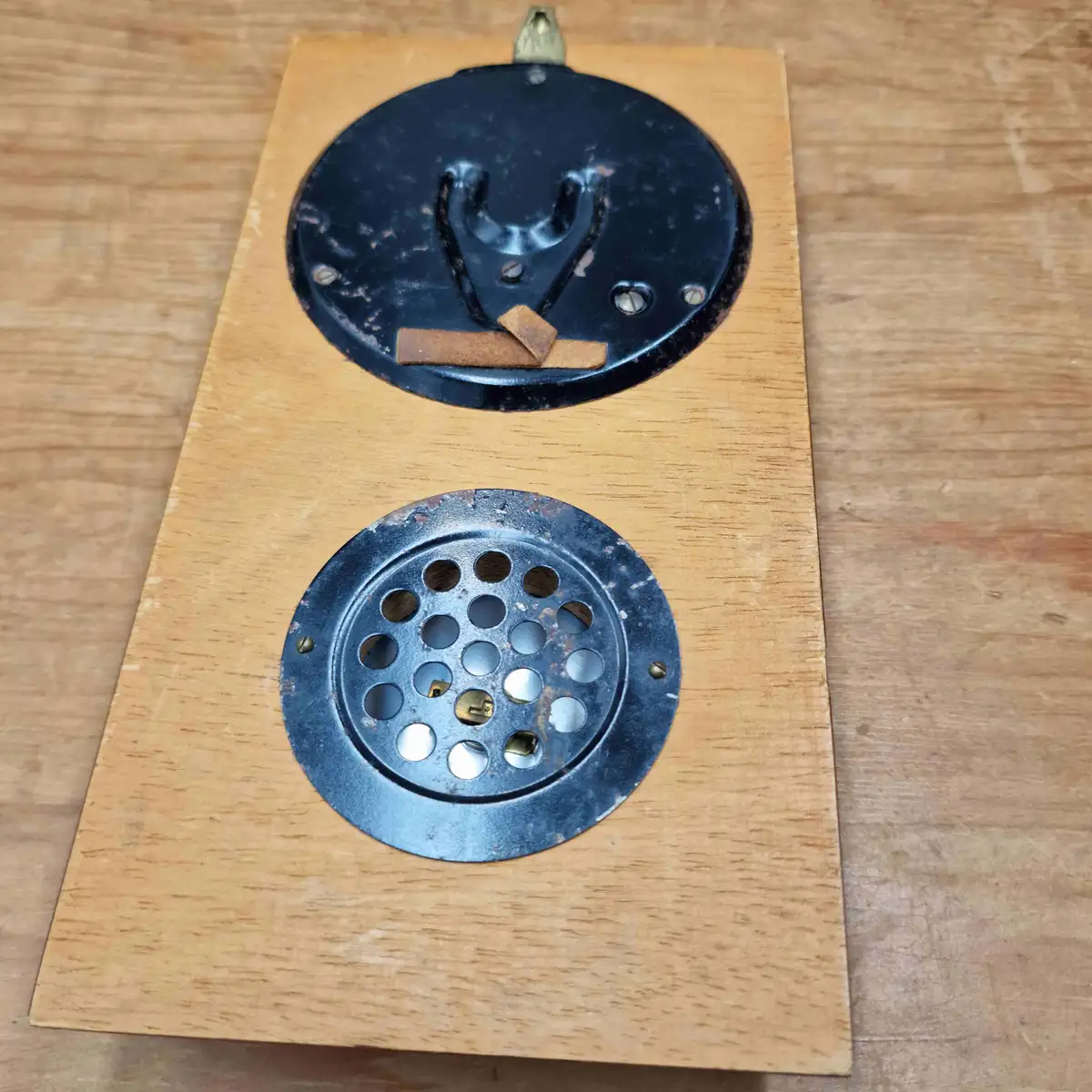 This Barometer and Thermometer is German and in good working order. The dial fronts are glass and surrounded by brass like detail with a brass hanging clip.